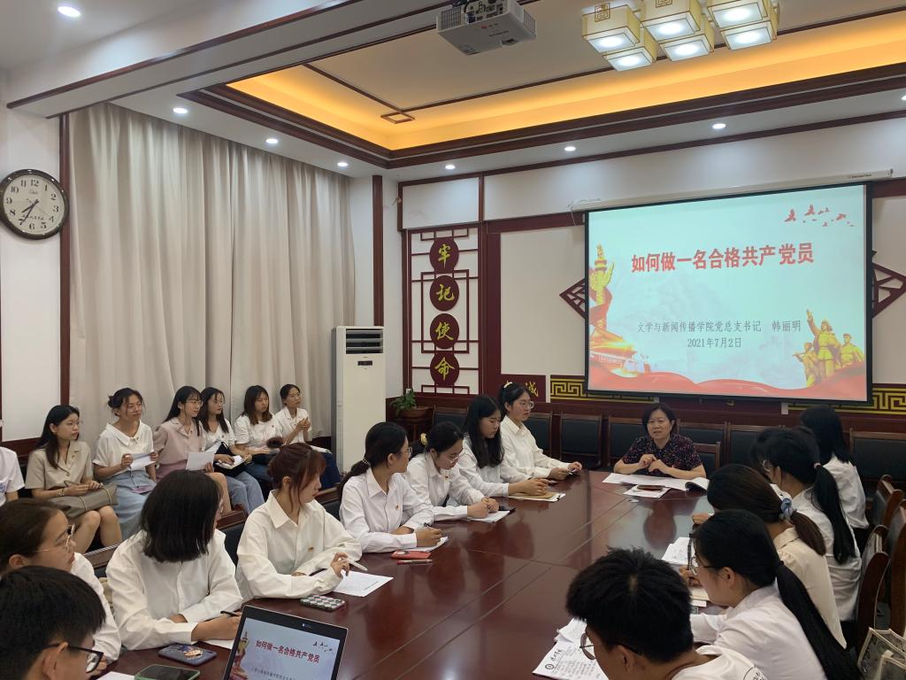 文学与新闻传播学院紧紧围绕“学党史、悟思想、办实事、开新局”主题,为认真贯彻“学史明理、学史增信、学史崇德、学史力行”要求,2021年7月2日晚,中共tyc122cc太阳成集团文学与新闻传播学院第一、第二、第三学生党支部组织全体党员召开党史学习教育专题组织生活会。文学院党总支负责同志认真履行“一岗双责”,积极参加各自联系党支部的组织生活会进行莅临指导。