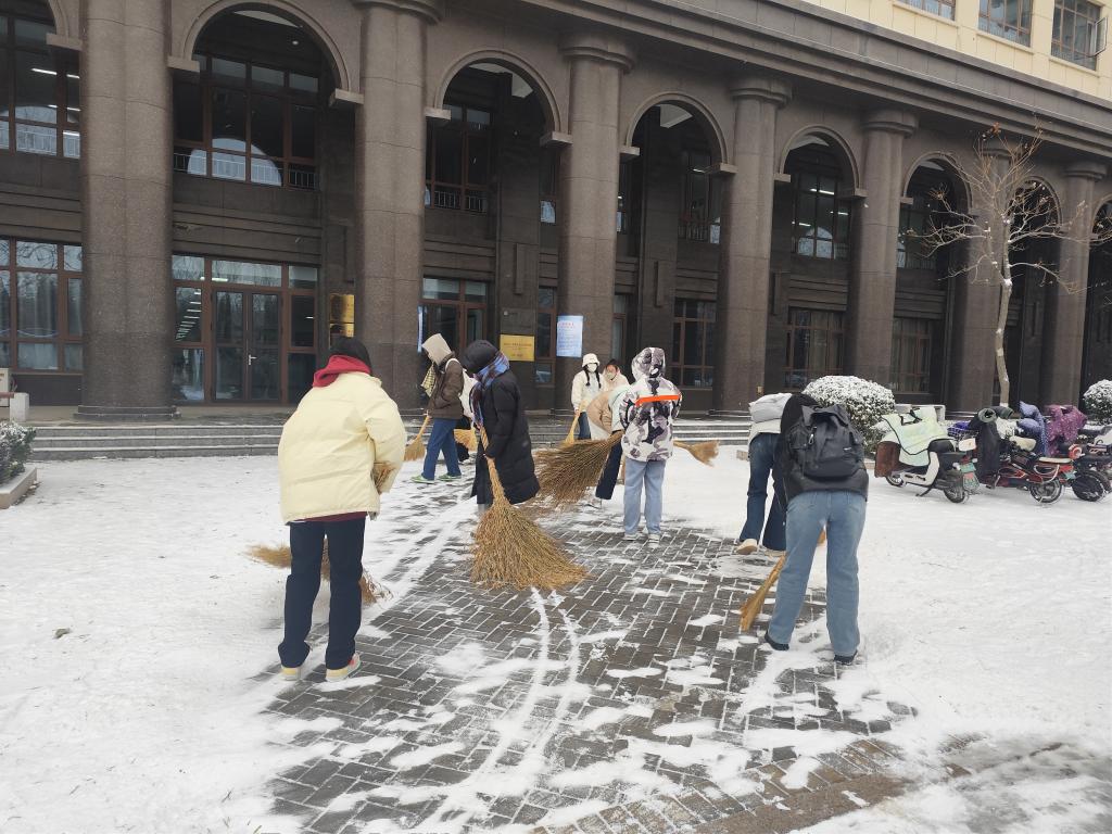 瑞雪兆丰年,今天鲁北大地迎来了入冬以来第一场大雪。12月11日清晨,大地已经银装素裹,皑皑白雪铺满了校园,装扮出了一处处的新奇雪景,但也给大家出行带来些不便。文学与新闻传播学院学生党员、入党积极分子和学生会同学,一个个喜气洋洋,干劲十足地纷纷投入到扫雪行列中来,在博文楼前后左右,男生用铁锨把雪铲松动,女同学用扫帚清出道路……,很快一条蜿蜒的雪中安全小径呈现在大家面前。热火朝天的扫雪结束后,同学们堆起了雪人,打了几下雪仗,深入体会了一下北国雪景的美妙。