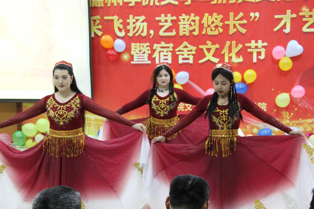 现场气氛热烈,同学们以宿舍集体为基本单位灵活组队,组成了15个节目表演。带动气氛的开场舞让会场里的欢呼声延绵不断,《风吹麦浪》、《时间煮雨》、《陪你去流量》……选手们悠扬的歌声,掀起心中的阵阵波澜。古典舞表演《三寸天堂》,舞出古风古韵又显“国潮新貌”。《新疆舞》节目中,随着卡龙琴清脆悦耳的琴声飘过,新疆舞者以灵活的手腕和极高的柔韧度,向全场师生展现了少数民族的风采。《木瓜》、《诗意中国》朗诵节目中的选手们凭借良好的精神风貌和极佳的语言功底,赢得了评委老师和观众们的热烈掌声。