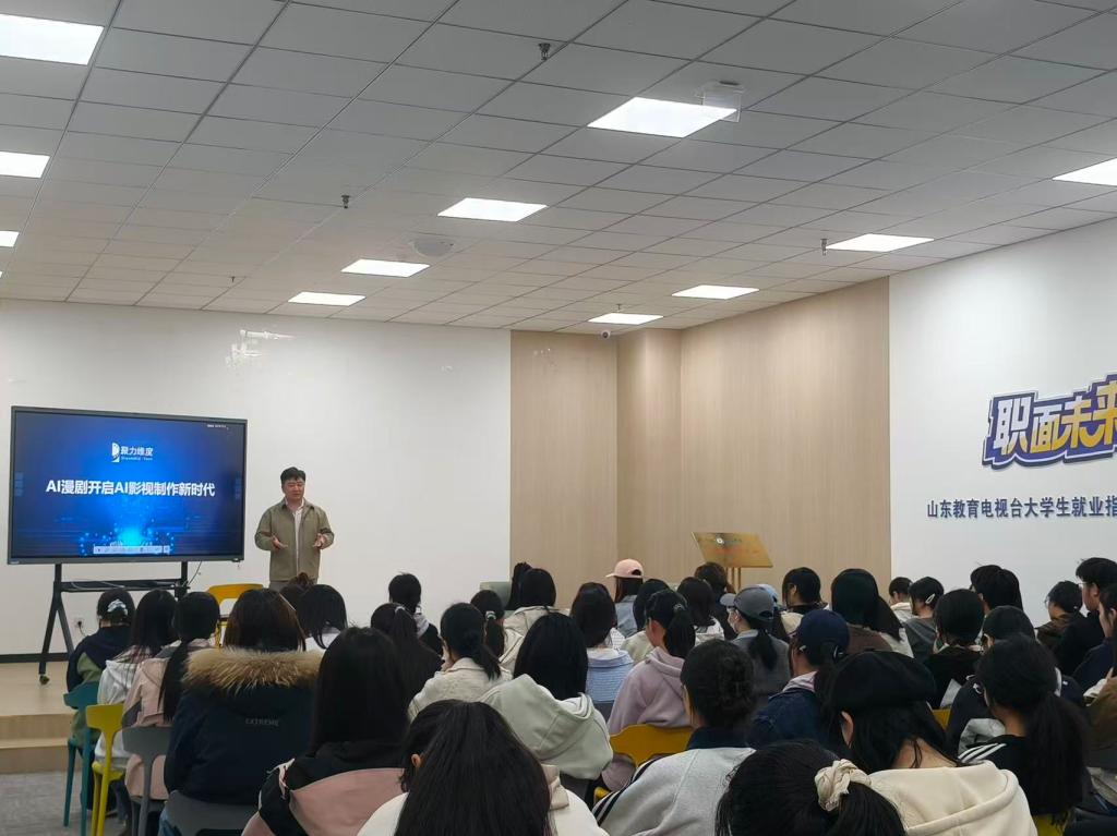 宣讲现场,聚力维度的企业代表给大家详细介绍公司情况,重点分享AI精品短剧赛道的行业前景,还讲解了企业的市场优势、技术优势、赛娲大模型的核心能力与未来发展规划,让同学们直观了解到AI+3D影视制作领域的发展潜力。针对太阳成集团122ccvip同学的专业特点,企业代表还专门介绍了适配岗位的招聘需求、岗位职责和职业发展路径,耐心解答大家关于实习、薪资、成长通道等问题,现场交流氛围十分热烈。