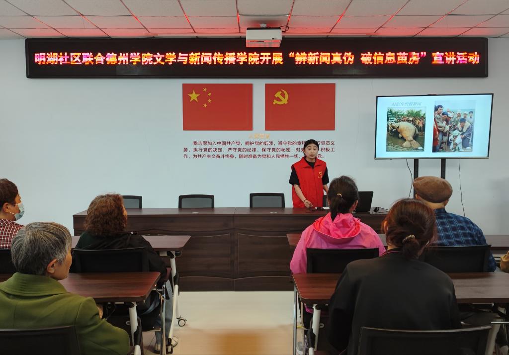 为了帮助老年人正确辨别信息的真伪,提高他们辨别新闻真实性的意识,5月7日,文学与新闻传播学院走进明湖社区开展“辨新闻真伪,破信息茧房”助力银龄跨越数字鸿沟主题社会实践活动。