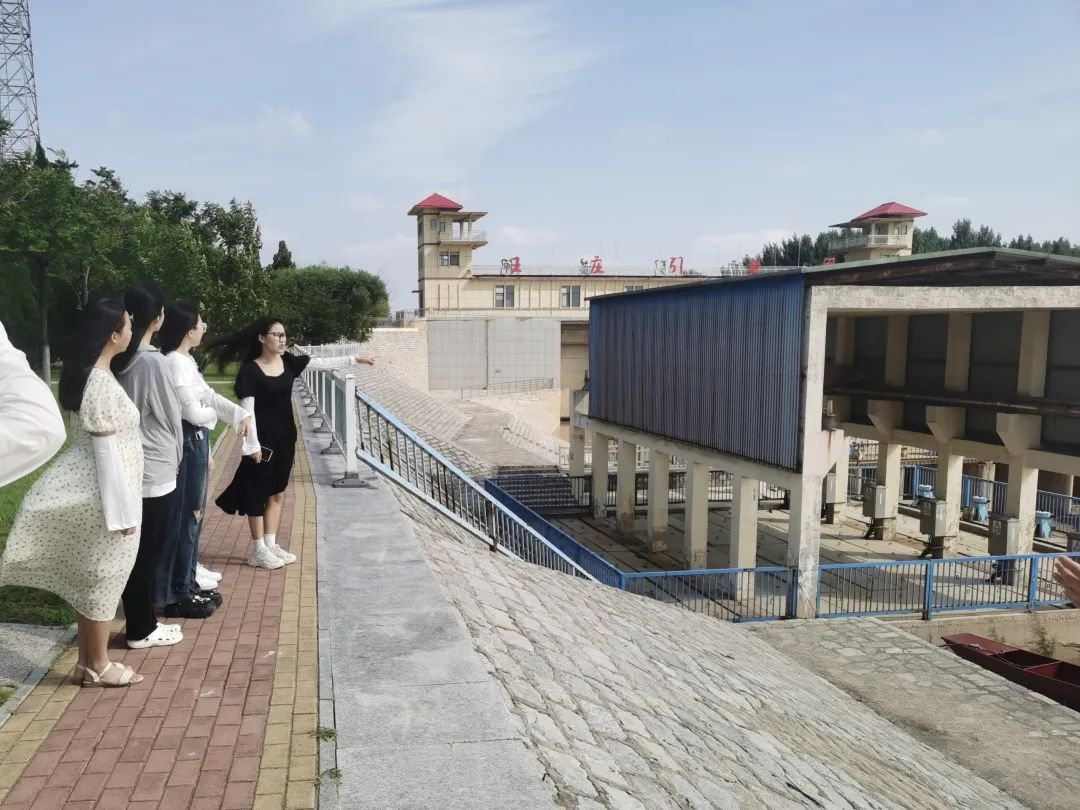 离开防石跺,走了不久,便看见了王庄引黄闸,闸下是四个巨大的卷帘门式样的闸门,在大闸之北是奔腾不息的黄河,在入闸之前的地段有许许多多的发动机组,但更多的是以往开闸引黄后留下的来自黄河的淤泥,目之所及皆是泥土。听到介绍,在王庄引黄闸开闸的时候,引入大闸的黄河水的景象震撼人心,叙述者满脸惊叹,回味无穷。黄河防汛工作的不易是课本中无法体现的,实践团来到此切身体会,心中满是敬畏。