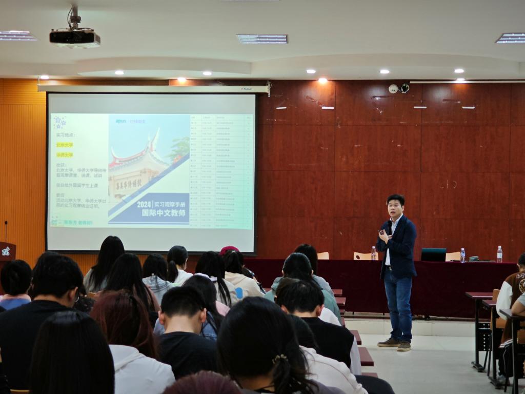 本次活动邀请新东方比邻中文海外中文事业部总经理、延安大学校外就业创业导师陈绍蔚总经理,为大家带来了《未来5—10年的黄金赛道,国际中文教师职业前景》的主题宣讲。通过陈总经理的精彩宣讲,学生们对当前国际中文教育行业人才市场需求、未来发展前景例如公派教师、志愿者项目有了更深、更全面的了解。同时,陈总通过新东方海外中文教学案例展示,鼓励更多的优秀大学生发挥专业特长、投身中文国际教育、传播中国声音、讲好中国故事,在把握新时代、建功新时代中不负青春、实现人生价值。