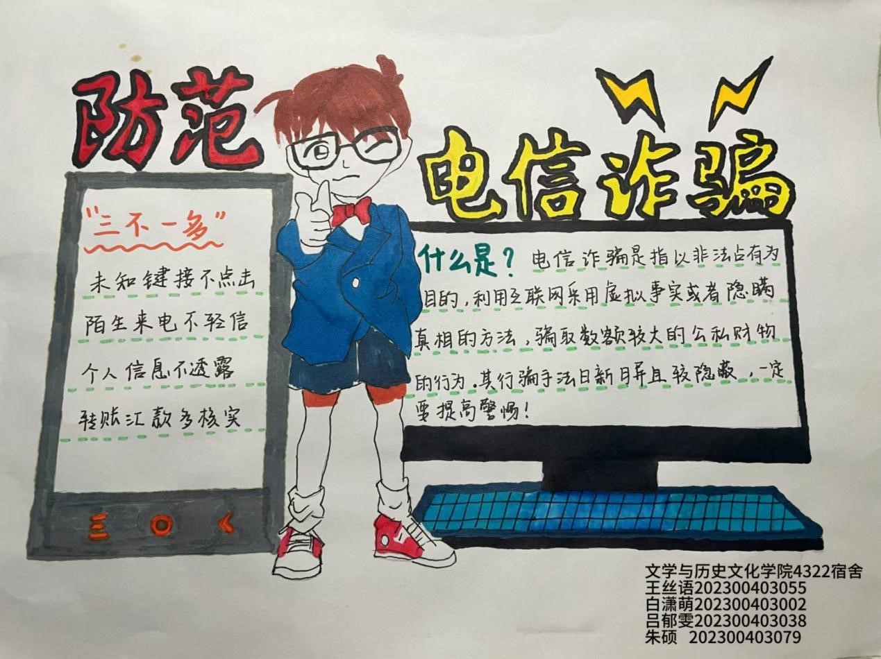 活动现场热闹非凡,同学们的参与热情高涨。其中,手抄报和征文稿这两种形式成为了活动的两大亮点,在手抄报中,同学们借助鲜艳的色彩、有趣的动漫形象来传播反诈知识,这些元素相互融合,生动形象地展示了诈骗的各种形式和危害,彰显出同学们对防范诈骗的决心。征文稿则像是一扇扇通往真实世界的窗户,同学们用真挚的笔触,将自己或身边遭遇的诈骗过程一一呈现。从如何识别那些看似无害实则暗藏玄机的可疑电话、短信,到如何在网络的海洋中保护好个人信息安全,每一个细节都体现了同学们的用心。本次活动增强了同学们的反诈意识,为校园安全教育注入了强大的动力。