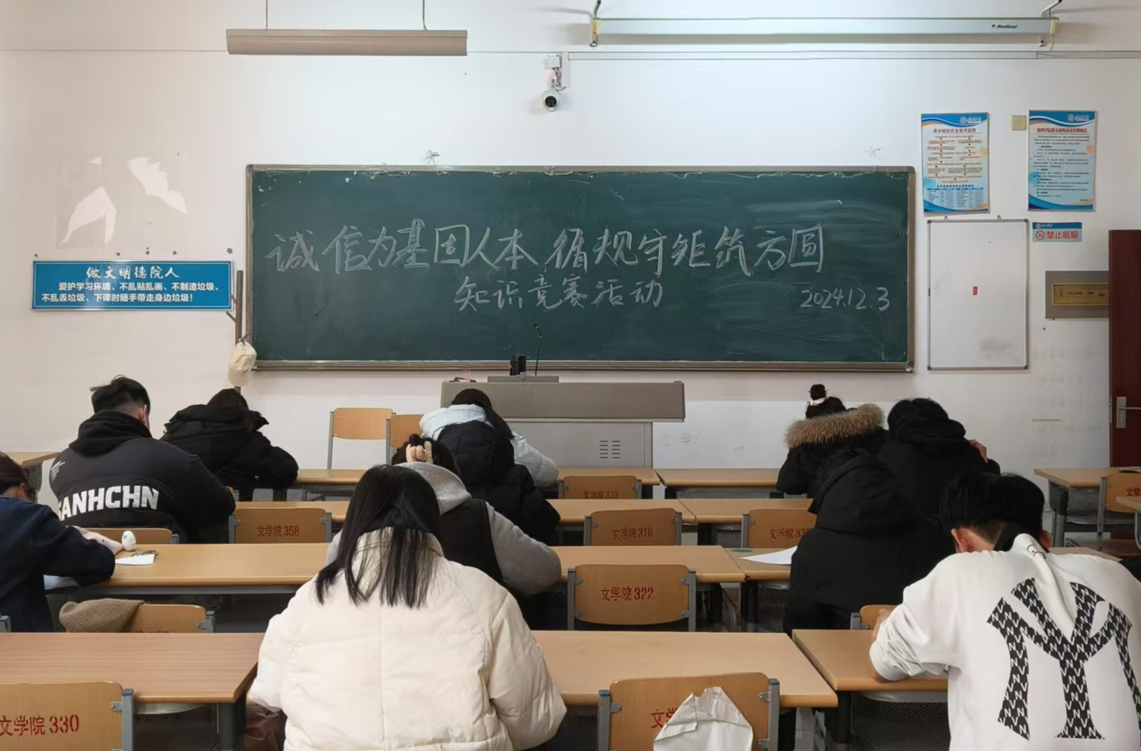 活动期间,同学们积极参与,展现出了对诚信与规则的高度重视。活动现场秩序井然有序,同学们入场后按照要求主动上交手机等电子设备并隔开就坐,展现出了高度的纪律性和自律精神,还体现了对公平竞争原则的尊重。竞赛内容紧密围绕诚信理念、学校规章制度等展开,通过多种形式的题目设置,不仅考验了学生的知识储备,更激发了他们对品德修养和行为规范的深刻思考。选手们在赛场上冷静思考、踊跃答题,现场气氛热烈而紧张,充分体现了文学院学子积极向上的精神风貌。