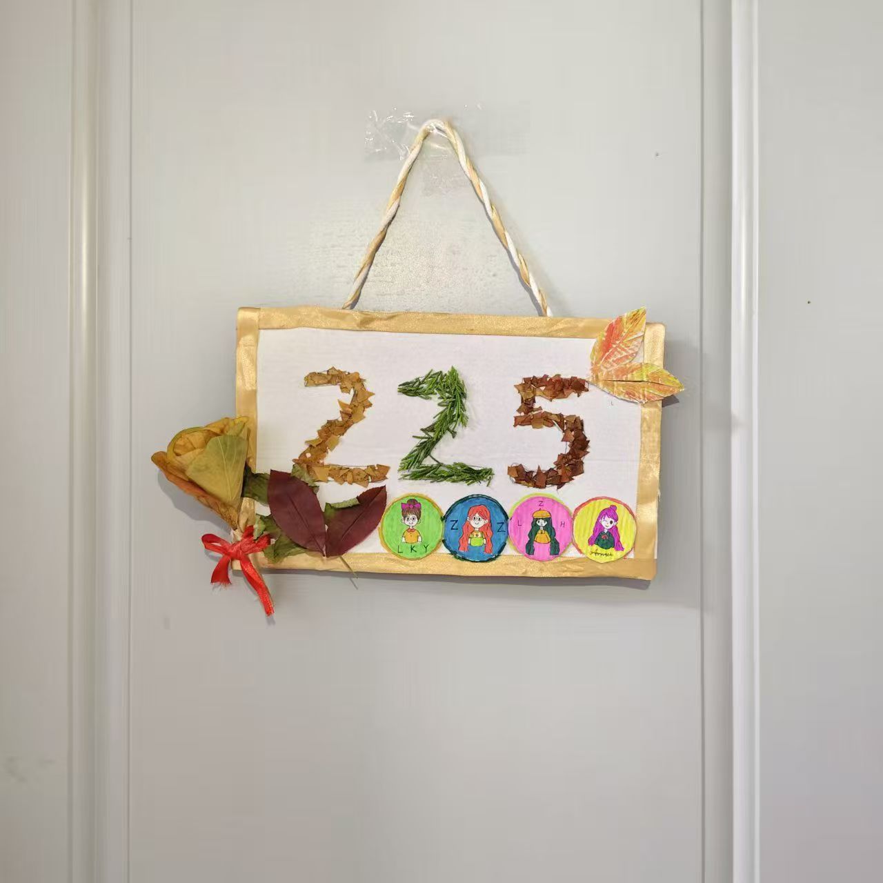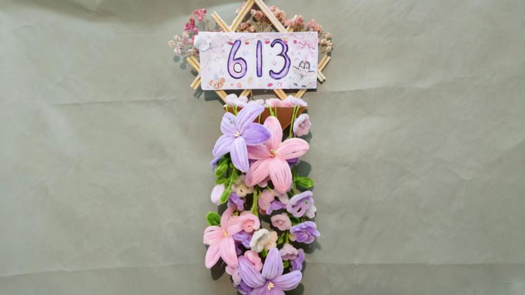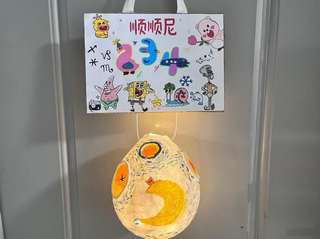 活动中,同学们积极利用回收的旧纸箱、塑料瓶、落叶等闲置物品,结合水彩绘制等方式,共同打造出一系列富有特色的宿舍门牌:纸箱被裁剪为各色形状并绘上缤纷色彩;扭扭棒巧妙成型,成为精致装饰;落叶通过拼贴重现自然之美;更有灯球、贴纸等元素的融入,为设计增添了温暖而生动的视觉效果。这些风格多样的门牌,不仅美化了宿舍环境,也凝聚了宿舍成员之间的默契与情谊。