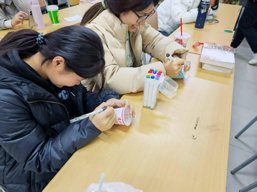 活动伊始,负责人分发空白纸杯与彩绘工具,引导学生以“情绪色彩学”为灵感,用不同色调、笔触勾勒当下心境,将压力、喜悦等感受转化为专属纸杯画作。互动环节有序开展,学生手持原创纸杯画作进行交流,结合作品阐述创作心境与背后故事,在沟通中深化情感联结。现场同步设置“心愿杯贴”环节,参与者在他人作品上张贴暖心便签,以文字传递理解与鼓励,承载心意的纸杯成为心灵沟通纽带,助力心理疗愈与同辈温暖在校园传递。