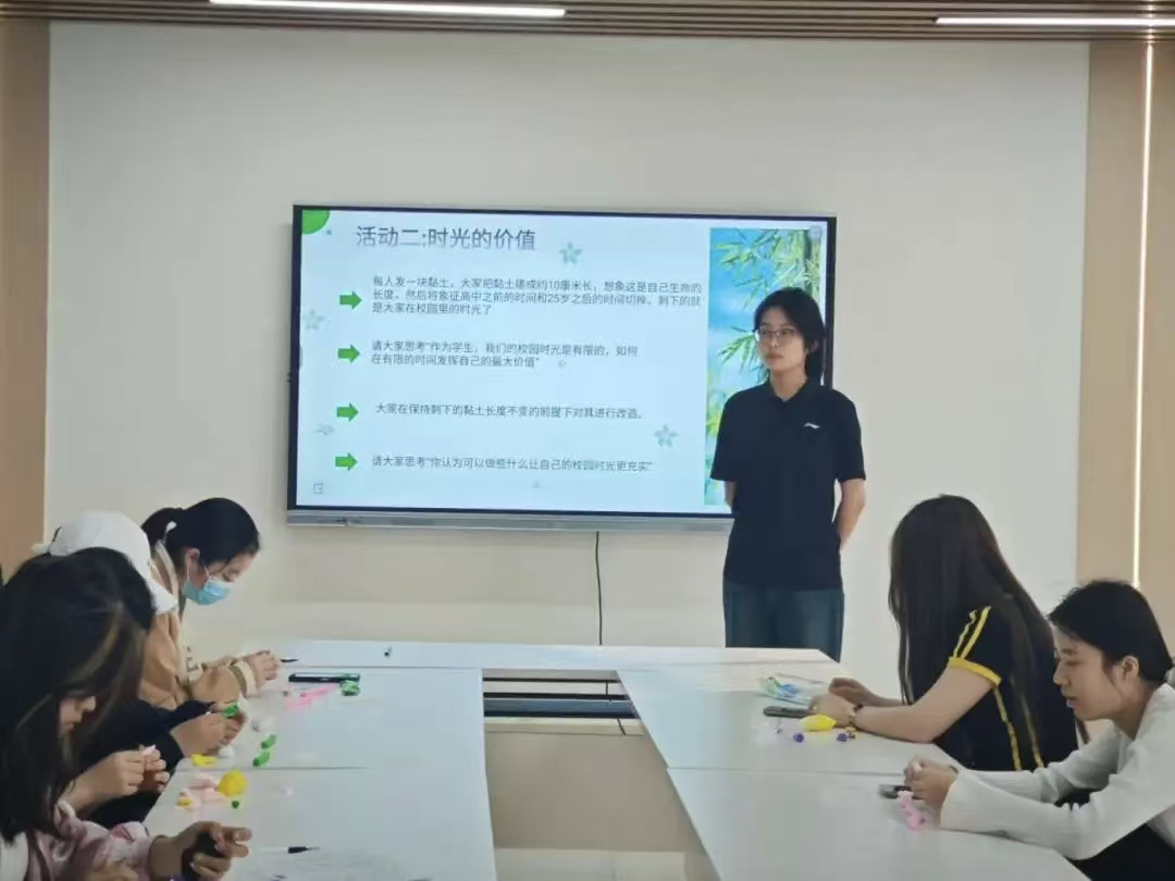 活动设置了三个兼具互动性与现实意义的环节,同学们积极参与到各个环节之中。在“梦想描绘”这一环节中,大家用缤纷的色彩在画布上展开创作,将心中的梦想具象化;随后大家共同探讨了“时光的价值”,同学们对象征校园时光的黏土进行创意重塑,在动手实践的过程中深入思考时间的价值,并互相分享各自的时间规划心得。当提及可以做些什么让自己的校园时光更充实时,大家各抒己见,思想的火花在交流中不断碰撞,为彼此剩余的校园时光提供了更多的可能性。同学们在互动中收获成长,对自身有了更清晰的认识,心理韧性不断增强,同时此次活动为学生提供了释放压力、表达自我的平台,营造了积极健康的校园心理氛围,更让学生在实践中锻炼了创新思维、时间管理等综合素养。