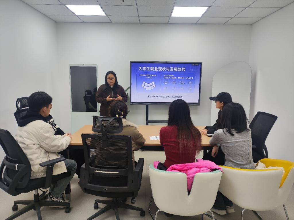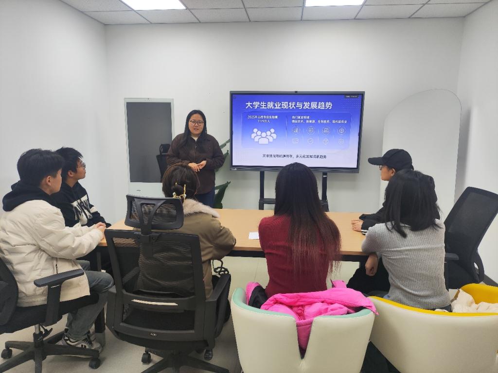 活动现场,指导老师以2025年高校毕业生就业数据为切入点,系统分析了当前大学生就业的整体形势,解读了信息技术、生物医药、现代服务业等热门就业领域的发展特点与人才需求。结合文学与历史类专业的就业特性,老师深入剖析了文科毕业生的就业优势与挑战,指出文化创意、教育培训、公共服务等领域为专业对口的主要就业方向,同时介绍了跨领域就业的可行路径。