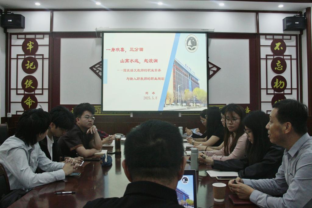 刘冰老师以诗意的语言开篇,从“专业能力”“师德师风”“学习能力”三大维度阐释语文教师的职业素养。他指出,专业能力是立身之本,需夯实学科素养,同时掌握多样化教学方法,并善用AI技术赋能课堂;师德师风是教育的灵魂,强调要以“四有”好老师为标准,怀揣教育情怀与职业敬畏,尊重学生个体差异;学习能力则是发展之源,注重在师生互动中持续成长。针对职业规划,刘冰老师提出“三阶段成长路径”:适应期重基础,提升期强教研,成熟期创特色。参会同学纷纷表示,讲座既具有理论深度,又充满人文温度,为未来职业发展提供指引。