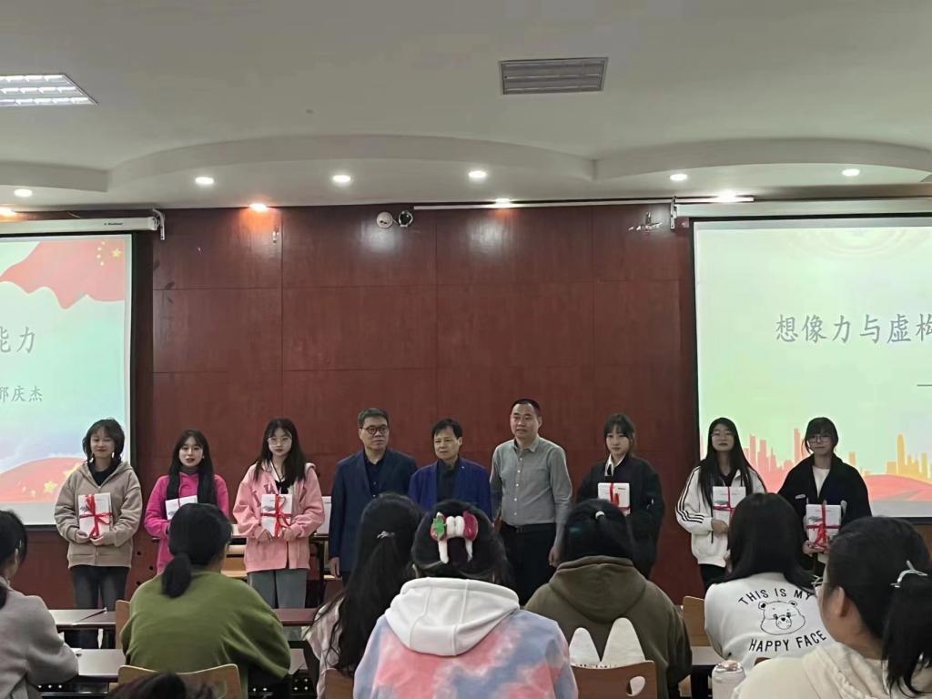 捐赠仪式前,邢庆杰主席向同学们做了《想象力与虚构能力》的讲座。他首先介绍了个人的文学成长之路,他由一个农民子弟,怀着文学梦想,克服种种困难,最终成为国家一级作家,他的个人成长经历对同学们极具震撼作用。接着他从自己的一部小说入手,采用文本细读的方式,分析一部好的作品的构思过程,以及在这一过程中作家如何充分地运用想象力进行虚构。