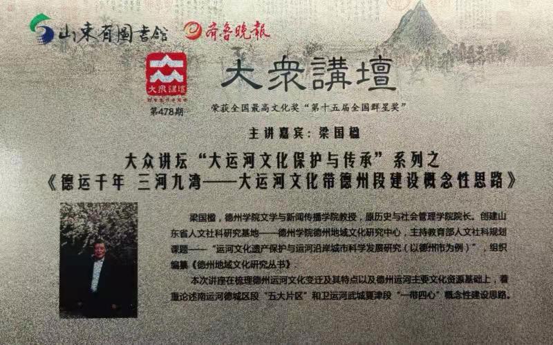12月8日,应“大众讲坛”之约,文学与新闻传播学院梁国楹教授作为主讲嘉宾,为全国观众作了题为“德运千年 三河九湾——大运河文化带德州段建设概念性思路”的学术讲座。梁教授在梳理德州运河文化主要特点、核心资源的基础上,着重讲解了大运河文化带南运河德城区段“五大片区”和卫运河武城夏津段“一带四心”概念性建设思路,受到与会观众的热烈欢迎。
