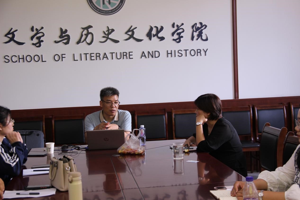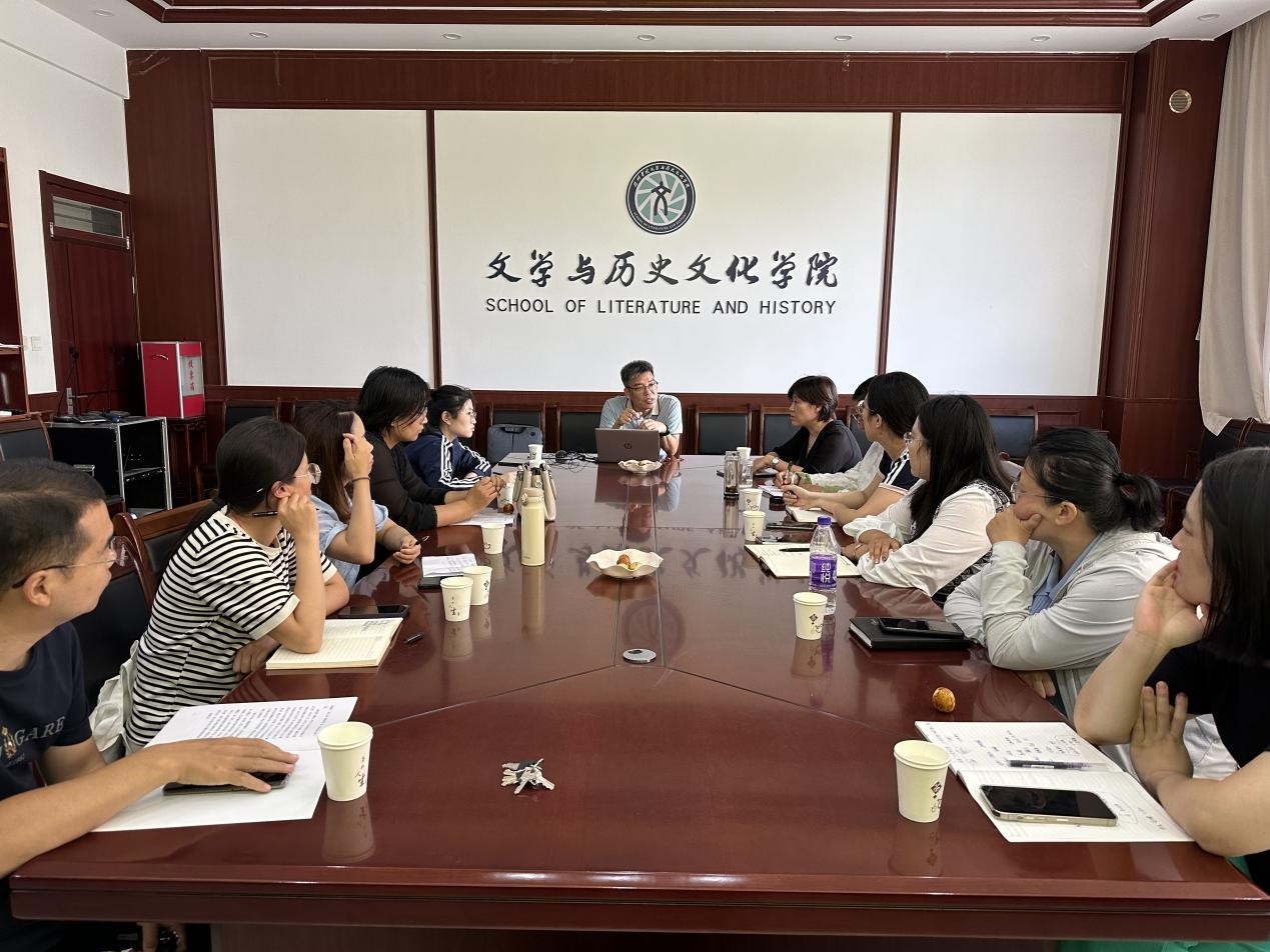 会议伊始,李连伟副教授向与会的各位学者讲解了国际中文教育领域的发展前沿,他提到汉语言文学专业要紧跟时代步伐,主动利用数字化信息技术为专业赋能,孕育一批高质量国际中文教育的优质课程资源,主动把“路”走宽。随后,学院副院长马超就自身从事国际中文教育工作的经验与李连伟副教授展开深度对话,在场各位老师也就自身的研究方向和对外教育经历展开交流探讨。最后,李连伟副教授以自己的科研成长经历激励各位青年博士躬耕教坛,不断攀登,持续为中华优秀传统文化创造性转化和创新性发展贡献智慧和方案。