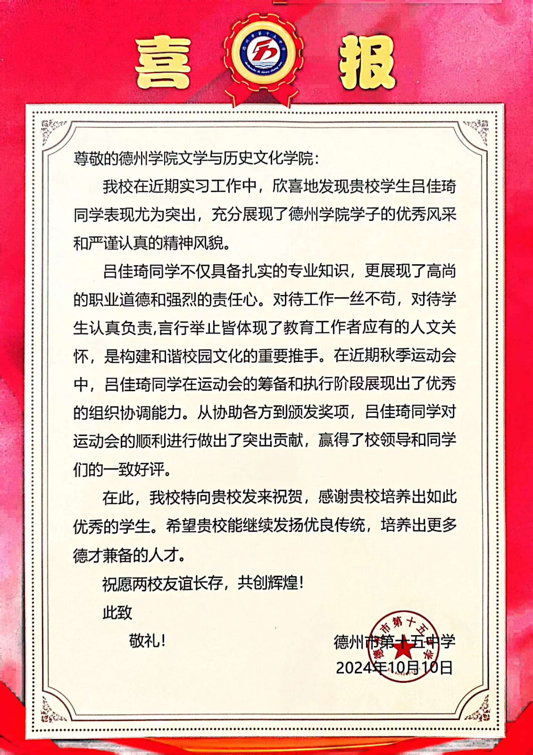 喜报:优秀!德州市第十五中学向我院赠送喜报