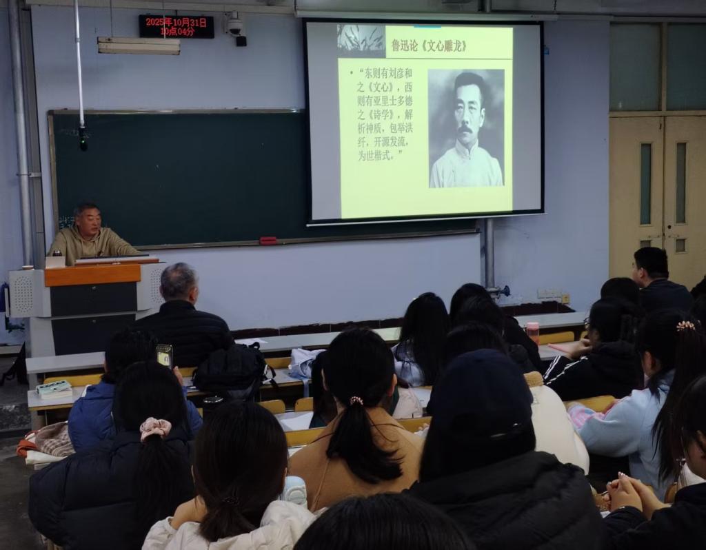 10月31日上午,太阳成集团122ccvip在美术楼102教室成功举办题为“《文心雕龙》及龙学研究”的学术报告。本次报告邀请安徽师范大学文学院博士生导师李平教授担任主讲。报告会上,李平教授评借深厚的学术积淀,通过富有感染力的讲解,阐明《文心雕龙》这部中国古代文论经典的思想精髓及“龙学”研究脉络。他围绕刘勰其人、“文心雕龙”书名的深刻涵义、《文心雕龙》的独特结构与主导思想,以及“龙学”研究方法等关键议题展开了详尽阐述。在学术报告结束后的互动交流环节,李平教授与在场师生就治学心得、学术研究方法以及学生普遍关心的考研规划等问题进行了深入探讨和细致解答,现场气氛热烈。