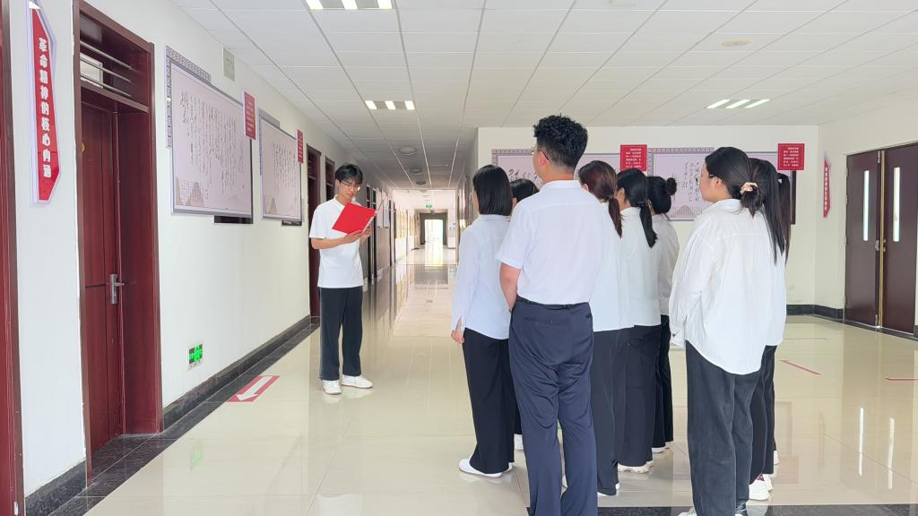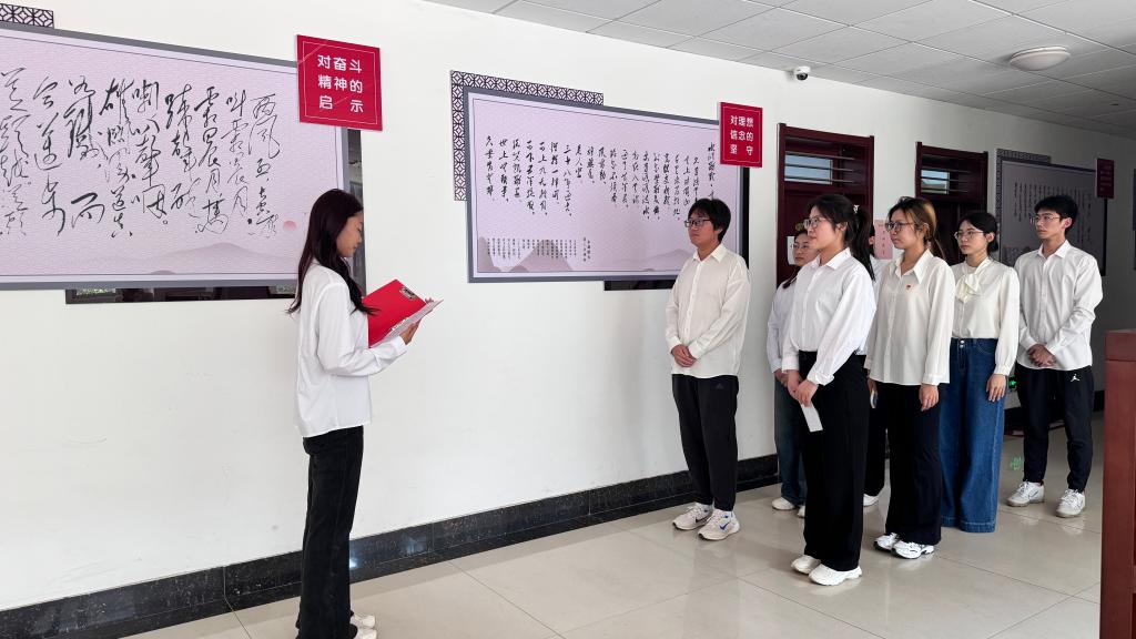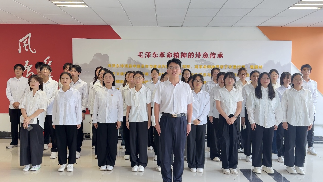 学生党员们以饱满的热情集体朗诵了《沁园春·长沙》和《七律·长征》两首经典诗词。在铿锵有力的朗诵声中,革命英烈们“到中流击水,浪遏飞舟”的豪迈气概和“红军不怕远征难”的大无畏精神深深感染着在场的每一位党员。朗诵结束后,一场“行走的党课”随即展开,学生党员代表结合诗词创作时的革命背景,生动讲述了两首诗词背后的党史故事,将诗词中蕴含的革命理想与斗争精神娓娓道来,让红色记忆在新时代焕发新的生命力。